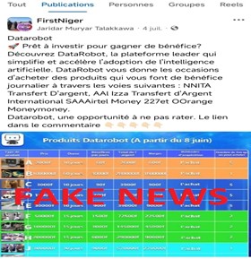 Cette publication de Jaridar Muryar Talakkawa publiée dans le groupe Facebook FirstNiger incitait les abonnés à investir dans une entreprise nommée Data Robot, promettant des gains substantiels. Cependant, il s’agit d’une escroquerie en ligne.