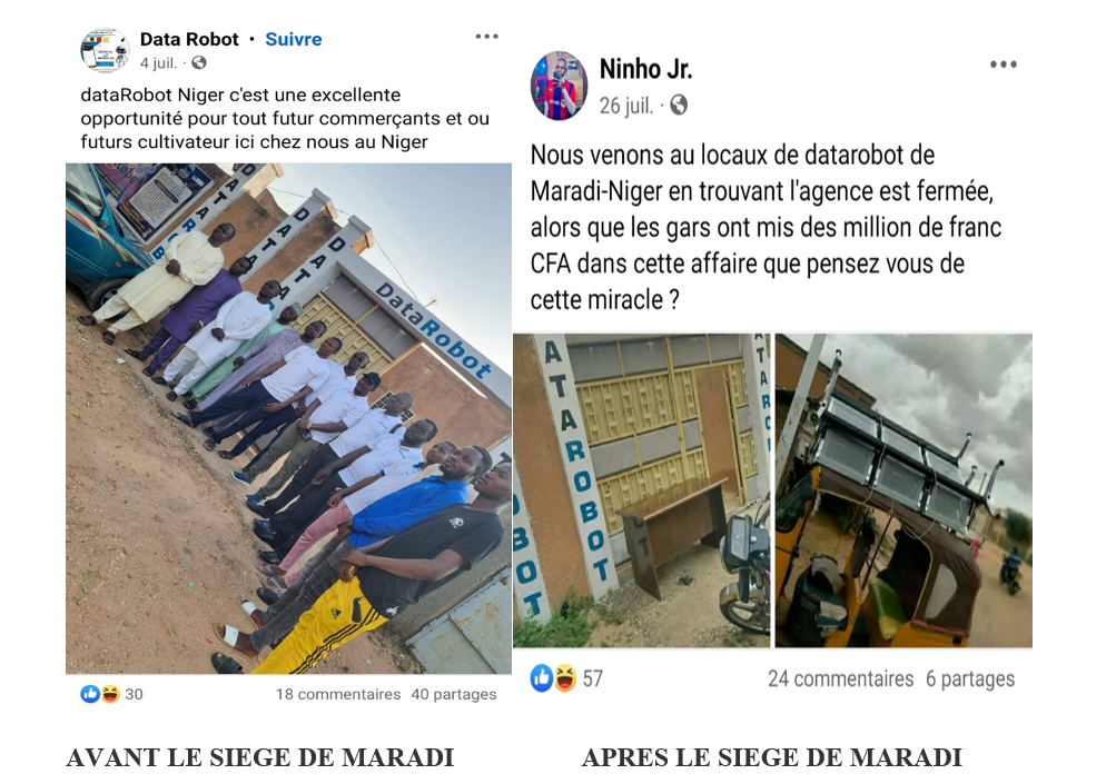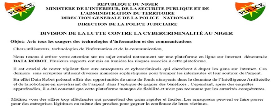 Ali Siradjé Salissou qui a témoigné dans un entretien qu’il a nous accordé’’ j’ai investi dans cette affaire une somme de deux cent cinquante mille (250 000) Francs CFA’’. En effet, le délai de perception de retour sur investissement étant dépassé sans que les clients ne reçoivent leur dû, ils se sont rendus au niveau des sièges de data robot de Niamey et Maradi. Malheureusement ils ont trouvé les locaux fermés et les responsables ont disparu. Face à l’ampleur de cette affaire, la Police judiciaire a lancé un avertissement à l’escroquerie. Les autorités rassurent le public en affirmant que des mesures sont en cours pour mettre hors d’état de nuire les malfaiteurs.