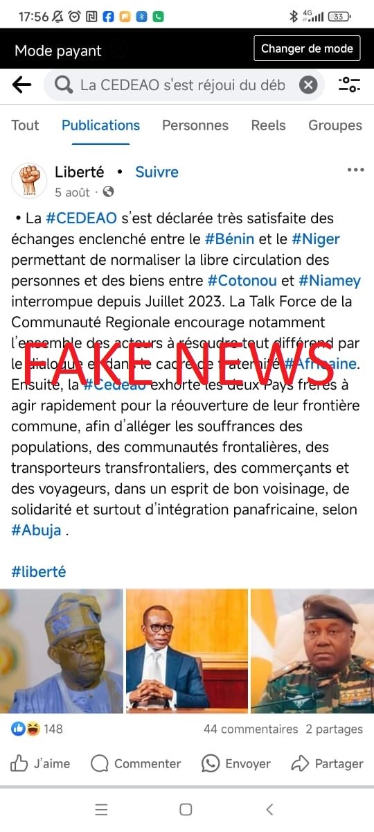 Cette publication a été publiée le 5 Aout 2024 sur la page Liberté créée le 22 Juillet 2021 à Marseille (France) qui dispose de 146 000 abonnés. Elle s’intéresse surtout à l’actualité politique et diffuse peu de fausses informations. Selon cette page, la CEDEAO aurait exprimé sa satisfaction suite au début du dialogue amorcé entre le Niger et le Bénin dont l’objectif est la normalisation de leurs relations diplomatiques notamment la reprise de la circulation des personnes et des biens entre les deux Etats.