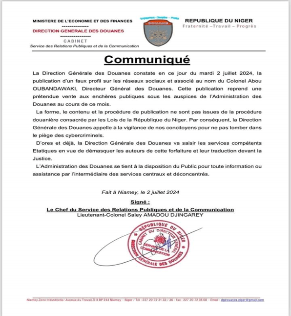 Selon ce démenti, le communiqué en question émane d’un faux profil associé au nom du directeur général, Colonel Abou Oubandawaki. Le chef du service des relations publiques et de la communication des Douanes a précisé que le faux avis ne respecte ni le contenu, ni la forme, ni la procédure de publication en vigueur au sein de la Douane nigérienne. La direction générale des Douanes a par ailleurs annoncé qu’elle saisirait les autorités compétentes pour sanctionner cette escroquerie.