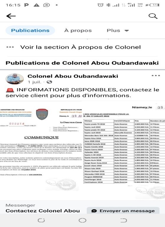 Diffusé le 24 Juillet 2024 dans un groupe WhatsApp dénommé « SOUTIEN AU CNSP DE LA COMMUNE RURALE DE N’GONGA », qui comptait 319 membres au 29 juillet 2024. Selon cette publication, la Direction Générale des Douanes du Niger procéderait à la vente de plusieurs véhicules le 3 août 2024 sur un site portuaire nigérien.