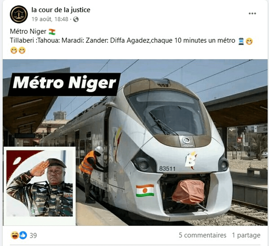 La publication Facebook date du 10 août 2024. Elle montre un train flambant neuf, accompagnée d’une photo du président de la transition nigérienne Abdourahamane Tiani, avec un message où est écrit « Metro Niger ».