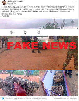 La publication, repartagée 57 fois, affirme que le véhicule funéraire, censé se rendre au cimetière, transportait des armes destinées à des groupes terroristes opérant au sein de l’Alliance des États du Sahel (AES), « précisément au Niger ». Trois photos illustrent ces affirmations : la première montre des militaires interceptant un véhicule blanc, la deuxième les montre soulevant un cercueil, tandis que la troisième révèle des armes et des munitions dissimulées dans ce dernier. Le texte accompagne ces images d’accusations contre « l’impérialisme », désigné comme responsable de ce « complot ».