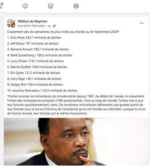 Un post publié le 14 septembre 2024 dans le groupe Facebook « 1 million de Nigériens » par un certain Gamatché Abdoulaye prétend que l’ancien président du Niger, Mahamadou Issoufou, figurerait dans le classement Forbes des dix personnalités les plus riches au monde. Il s’agit d’une infox.