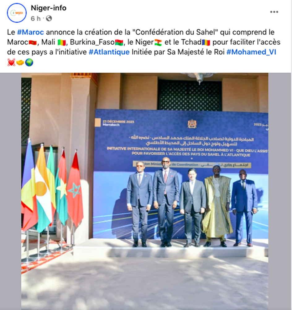 Une publication Facebook affirme que le Maroc aurait annoncé la création de la « Confédération du Sahel », comprenant le Maroc, le Mali, le Burkina Faso, le Niger et le Tchad, dans le but de faciliter l’accès de ces pays à une initiative internationale soutenue par le Roi Mohammed VI. Cette affirmation est cependant trompeuse.
