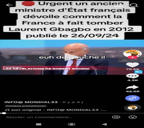 Un post sur TikTok prétend qu’un ancien ministre d’État français a révélé comment la France a contribué à la chute de Laurent Gbagbo en 2012. Cette vidéo, mise en ligne le 26 septembre 2024 sur une page comptant plus de 70 500 abonnés, présente en réalité un extrait d’une interview de Robert Bourgi sur France 24.