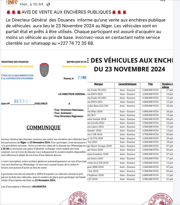Un post du 13 novembre sur Facebook prétend être un communiqué du Directeur Général des Douanes nigériennes, invitant les intéressés à s’inscrire via un numéro WhatsApp pour participer à une vente aux enchères de véhicules. Cette annonce est, en réalité, une escroquerie.