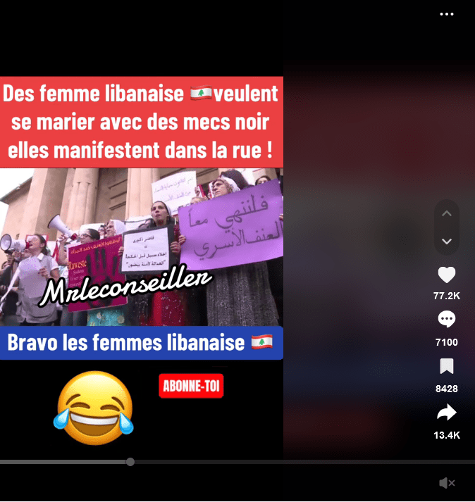 En haut de la vidéo est écrit : « Des femmes libanaises veulent se marier avec des mecs noirs elles manifestent dans la rue ! ».