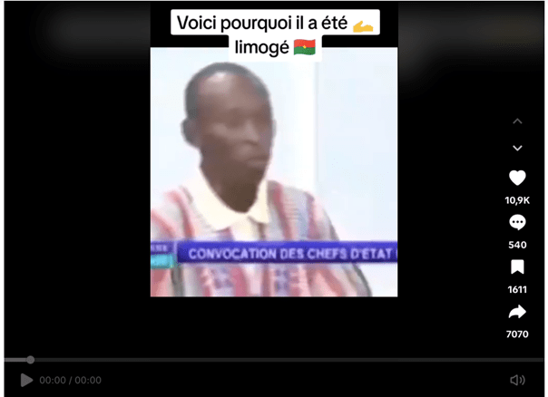C’est dans ce contexte que le 7 décembre 2024, une vidéo de 53 secondes a été publiée sur le compte TikTok « Perroquet du Sahel » avec pour titre : « Voilà pourquoi le premier ministre Burkinabè a été limogé ». Dans cette vidéo, on voit Apollinaire Kyélem de Tambèla qui déclare sur un plateau de télévision : « Les populations africaines devraient tresser une couronne pour Emmanuel Macron, parce que c’est un président révolutionnaire. Macron n’est pas un petit. Macron est un grand, et c’est un ami des populations africaines. »