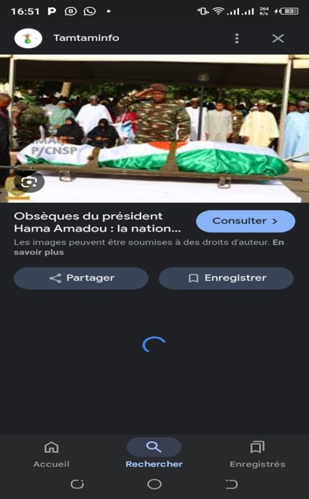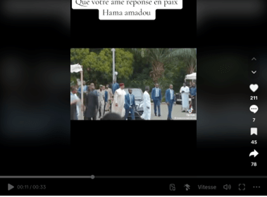La vidéo en question montre un cortège funéraire, avec la présence de Mohamed Bazoum aux côtés de plusieurs personnalités politiques, dont l’ancien Premier ministre Ouhoumoudou Mahamadou. Le texte accompagnant la publication indique : « Que votre âme repose en paix Hama Amadou ».
