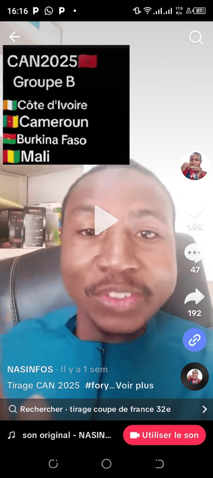 Le 25 novembre 2024, une vidéo publiée sur le compte TikTok @goods-vibs2 a fait le buzz en prétendant dévoiler la composition des poules de la Coupe d’Afrique des Nations (CAN) 2025, qui se déroulera au Maroc. Selon cette publication, le Mali, le Burkina Faso, la Côte d’Ivoire et le Cameroun seraient dans la même poule, la « poule B », que l’auteur qualifie de « groupe de la mort ». L’auteur insinue que ce groupe serait plus dangereux que la guerre entre la Russie et l’Ukraine et que ses compétitions seraient équivalentes à « la troisième guerre mondiale ».