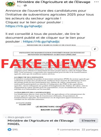 Une publication attribuée au Ministère de l’agriculture et de l’élevage demandant aux acteurs du monde agricole de candidater à une subvention est fausse. Cette annonce ne vient pas dudit ministère.