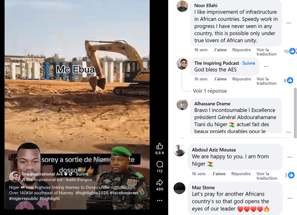 Le 19 juin 2025, la page Facebook The Inspirational Ark, comptant plus de 300 000 abonnés, a publié une vidéo affirmant qu’une nouvelle autoroute reliant Niamey à Dosso serait en construction. Dans la légende, on pouvait lire : « Niger 🇳🇪 new highway linking Niamey to Dosso under construction. Over 140KM southeast of Niamey« . La vidéo, visionnée plus de 100 000 fois, cumule plus de 8 600 likes, plus de 116 commentaires et près de 500 partages. L’analyse des commentaires montre que cette publication a suscité un vif engouement auprès des internautes. Même si quelques voix isolées ont tenté de tirer la sonnette d’alarme quant à la véracité de la vidéo, de nombreux internautes y ont vu une preuve des réalisations du gouvernement nigérien et n’ont pas hésité à saluer les actions de développement en cours.
