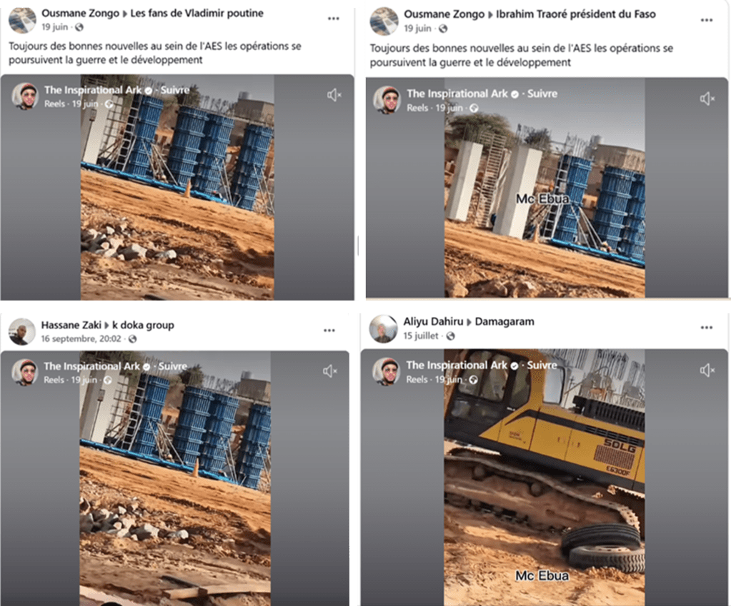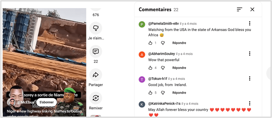 Entre juin et septembre 2025, la publication a aussi fait le tour de plusieurs groupes et pages sur Facebook, notamment Anonymous Élite Alpha, AFRIQUE D’ABORD, UKRAINE – RUSSIE – Actualités, vidéos et infos en direct, Les fans de Vladimir Poutine, Ibrahim Traoré président du Faso, Damagaram, k doka group et bien d’autres avec des commentaires encourageant les autorités des pays de l’AES.