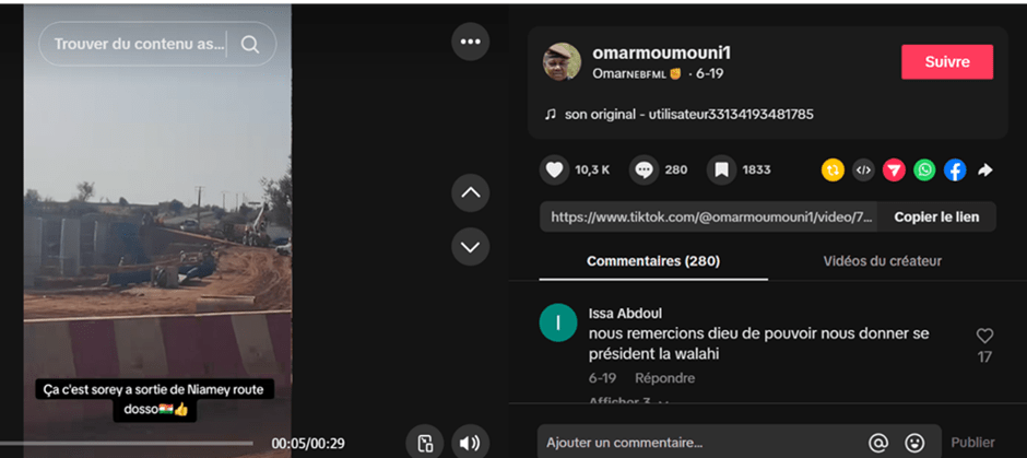 La vidéo montre des engins sur un chantier et des routes en travaux, mais il ne s’agit en aucun cas d’une autoroute de 140 kilomètres reliant Niamey à la ville de Dosso. Une simple recherche par images inversées nous ramène à la vidéo originale publiée sur TikTok le même jour du 19 juin 2025 par le compte Omarmoumouni1 avec comme commentaire : « ça c’est Sorey à la sortie de Niamey, route Dosso ».