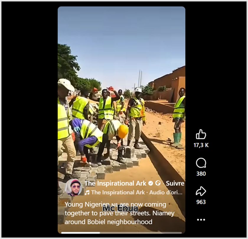 Quelques semaines après la publication sur le chantier fantôme d’autoroute, la même page Facebook The Inspirational Ark a publié une autre vidéo devenue virale avec plus de 17 000 réactions, 380 commentaires et 963 partages. Dans celle-ci, on pouvait lire ce commentaire en anglais : « Young Nigeriens 🇳🇪 are now coming together to pave their streets. Niamey around Bobiel neighbourhood ».