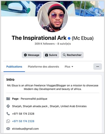 Ces deux vidéos ont un point commun : leur auteur. Derrière la page Facebook The Inspirational Ark se cache un individu appelé Chuo Elvis Ebua, alias Mc Ebua, un influenceur nigérian vivant à Sharjah, aux Émirats arabes unis (selon les adresses laissées sur sa page Facebook). Il se définit comme « panafricaniste ».